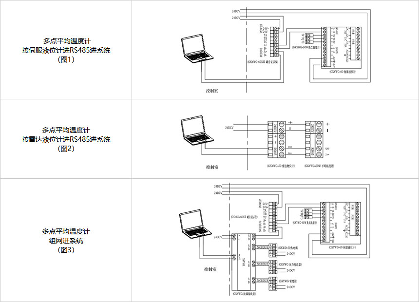 GKYWG-60W多點平均溫度計采用多點測溫原理,測量化工儲罐不同高度點的多個溫度值,實現液面上溫度、液面下溫度、平均溫度等值通過RS485 MODBUS協議或RTU方式進控制室PLC或DCS系統,實現多溫度參數監測控制儲罐設備溫度,可以與伺服液位計、雷達液位計連接遠傳至控制室系統。