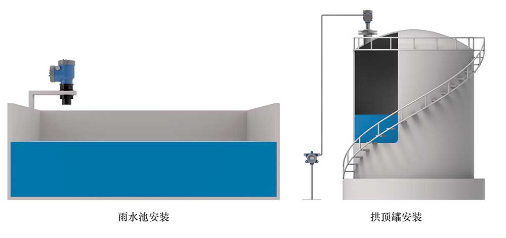 安裝要求:安裝于容器的上方,可直接安裝到儲罐罐頂,也可采用旁通管安裝,旁通管內徑≥200mm。探頭發射面垂直指向液面或料面;若為密閉容器,應采用法蘭式安裝,其它情況可采用支架安裝。安裝位置盡可能選擇液面平穩、料面平整的位置,遠離容器內注液(料)口,攪拌葉片、凹凸不平的容器壁等能夠阻擋聲波的物體,波束所輻射區域內不得有障礙物。